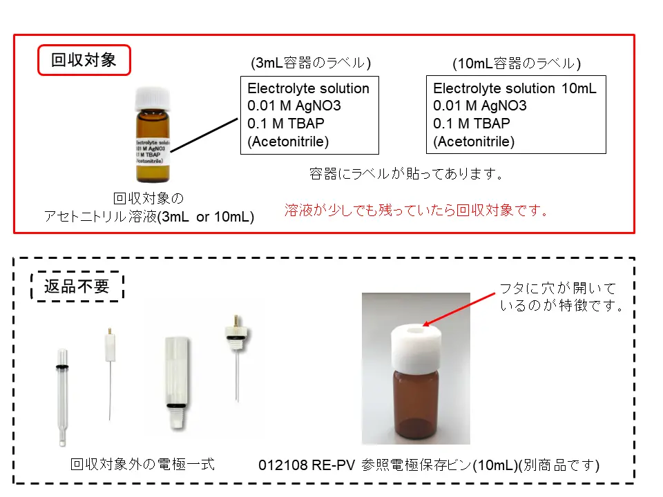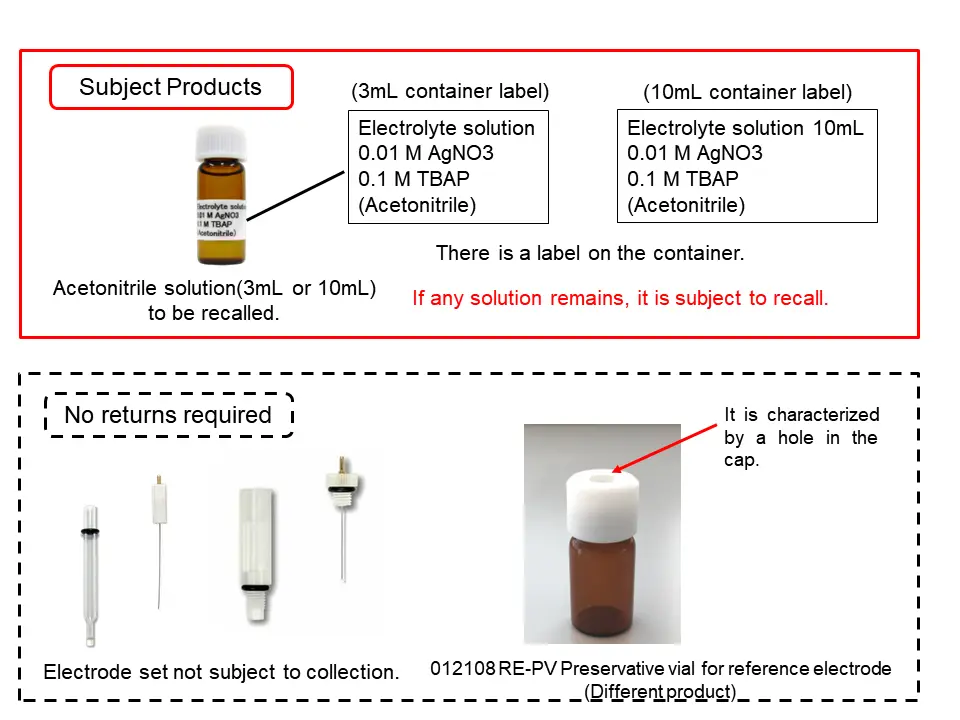 【対象商品】 1. 2022年11月まで販売していた商品 ・012171 RE-7 非水溶媒系参照電極(Ag/Ag+) ・013394 RE-7S 非水溶媒系参照電極(Ag/Ag+) ・013489 RE-7VT 非水溶媒系参照電極ねじ込み式 ・012549 RE-7 参照電極溶液(10mL) 2. 過去に販売していた商品 ・012040 RE-7 非水溶媒系参照電極(Ag/Ag+) ・012041 RE-7S 非水溶媒系参照電極(Ag/Ag+) ・012172 RE-7S 非水溶媒系参照電極(Ag/Ag+) ・012055 RE-7V 非水溶媒系参照電極ねじ込み式 ・012173 RE-7V 非水溶媒系参照電極ねじ込み式 ・012174 RE-7VP 非水溶媒系参照電極ねじ込み式 ・011131 RE-7 参照電極保存液(10mL) ・011974 RE-7 参照電極保存ビン(10mL) ・012039 RE-7 非水溶媒系参照電極溶液 3mL